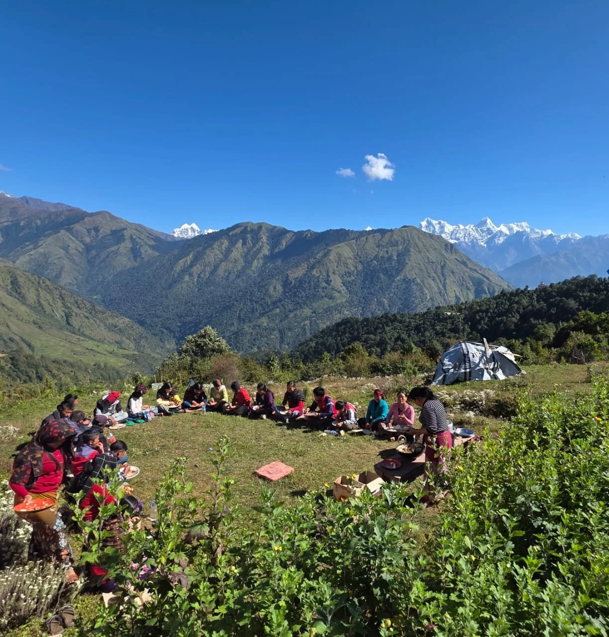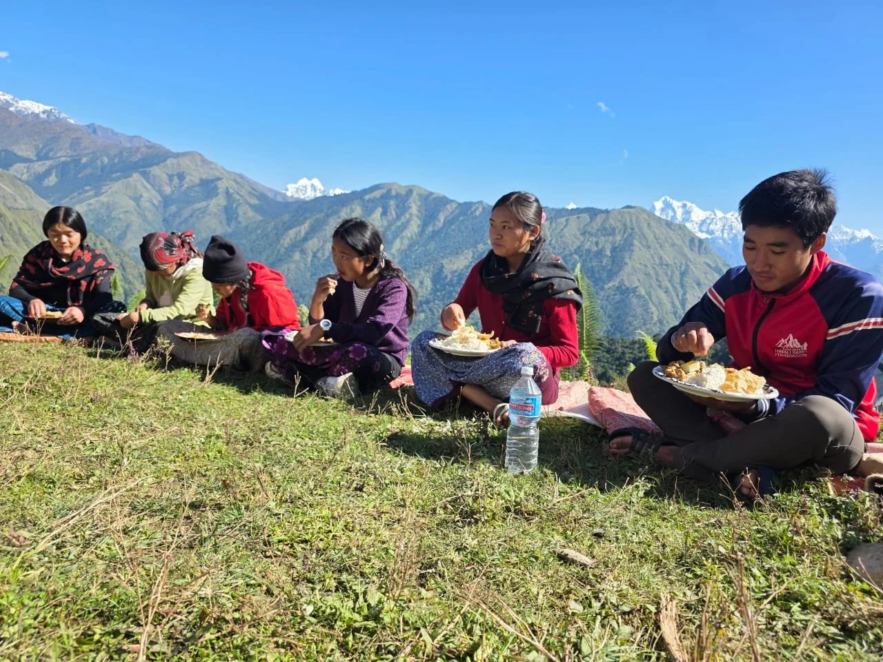 C'est dans un cadre idyllique que Sanjaya vient de rencontrer nos boursiers de Laprak. Avec Yam Kumari, Swikriti et la maman de Punam, ils leur ont préparé un bon dal bhat avec du poulet et des légumes.